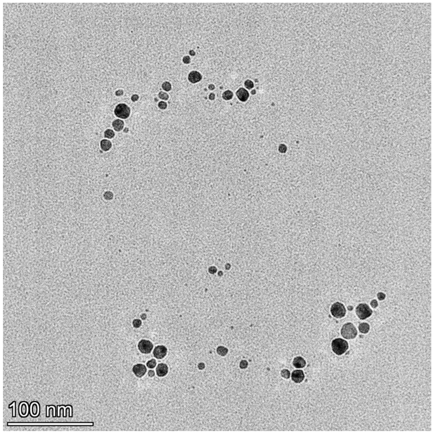 Drug-loaded AgNPs were synthesized according to previously reported methods [37]. Briefly, 1.25 g (0.007 mol) of fructose was dissolved in 25 mL of water and refluxed for 2 min; then, 0.63 mL of 0.01 M AgNO3 solution was added. MBH was added to the solution at a concentration of 1 mg/mL. After roughly 5 min of reflux, the solution’s color changed to a light yellow, signifying the formation of AgNPs. The synthesized AgNPs were characterized using different analytical techniques, such as UV-Vis, Transmission electron microscopy (TEM, Talos 1.15.3, Thermo Fisher Scientific, Waltham, MA, USA), dynamic light scattering (DLS, Brookhaven BI-200 goniometer, Brookhaven Instruments Corporation, Nashua, NH, USA), and the zeta potential (Brookhaven BI-200 goniometer, Brookhaven Instruments Corporation, Nashua, NH, USA). The TEM images confirmed the synthesis of smaller spherical particles up to 95 nm in size (Figure 2). The drug-loaded AgNPs were obtained with a controllable size due to carbohydrate assistance in the presence of [Ag(NH3)2]+ [55]. The carbohydrate coating also decreases the agglomeration rate and size [56].