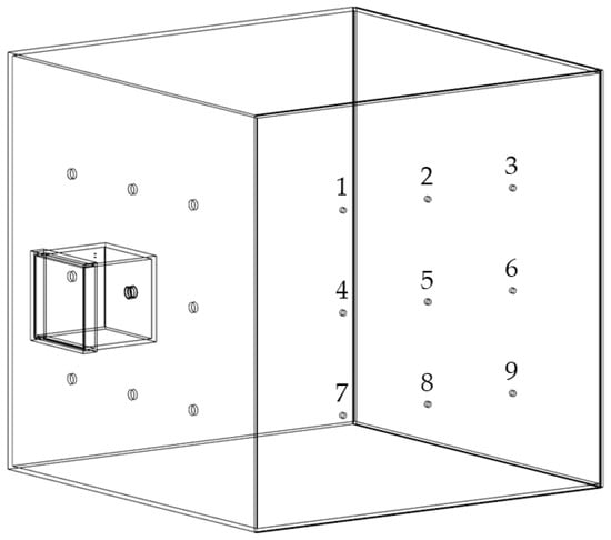 Simplified illustration of the chamber setup for dust measurements in orthogonal arrangement with measurement spots 1–9, modified after [].