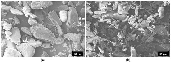 In Figure 3, SEM images of ACAM 1 (a) and ACAM 2 (b) are shown. It is clearly visible that the particles of the two different types of ACAM exhibited different shapes.