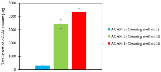 Totally settled amount of ACAM 2 after Cleaning methods I and II as well as that of ACAM 1 after Cleaning method II, on all nine filters within the IOM samplers (means ± SD, n = 3).