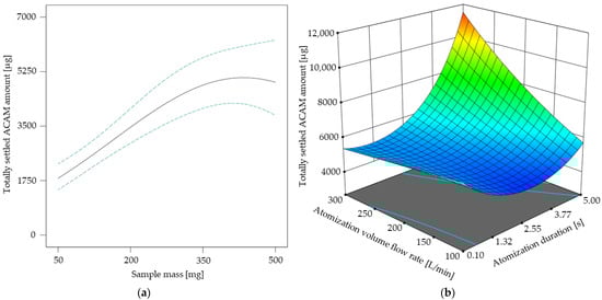 The response surface shown in Figure 5b describes the two-factor interaction of the atomization volume flow rate and the atomization duration. It is evident that the totally settled ACAM amount clearly increases if an atomization duration of over 2 s is combined with an atomization volume flow rate of more than 150 L/min. By combining these results, a high, totally settled ACAM amount may be achieved with sample masses as low as possible.