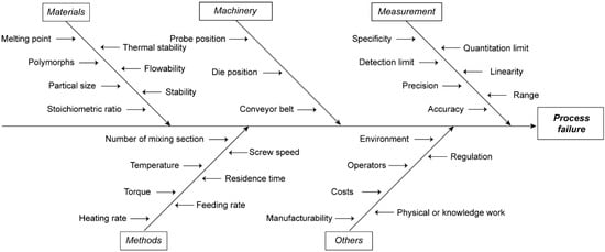 An Ishikawa diagram (Figure 1) has been summarized to show possible factors for process failure during HME. The following five attributions of risks have been identified during process development: (1) Materials, (2) Methods, (3) Machinery, (4) Measurement, (5) Others. In this work, we will discuss the first four area in details as well as some case studies that we have performed.