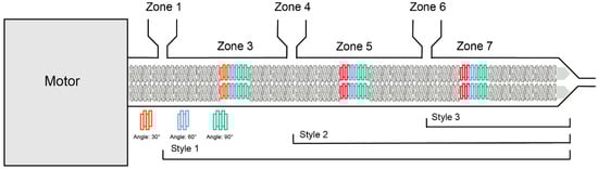 The screw configuration employed in this study is illustrated in Figure 2. The materials entered from zone 1 and then passed through varying numbers of engaging sections. The L/D ratio of the full screw was 40 and three individual kneading sections (length to diameter ratio is 6.5) were set at zone 3, 5, and 7.