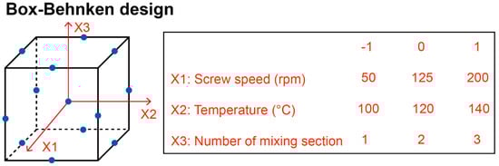 The Box–Behnken design was used to understand the correlation between impact factors and the HME process, which incorporated 12 design groups for the purpose of evaluating the impacts of various variables, and the center point was repeated for every 5 batches to check the reproducibility of the HME process. During the preliminary investigations, the heating rate, screw speed, screw design, and barrel temperature had already been optimized. Consequently, the screw speed (X1), temperature (X2), and the number of mixing sections (X3) were chosen as the independent variables to further optimize the formulation (Figure 3). The formation of CCs, particle size, and yield were used as the output for understanding the correlation and optimization of the HME process. Statistical computations were performed using Design Expert 8.0.6 software (Stat-Ease, Inc., Minneapolis, MN, USA).