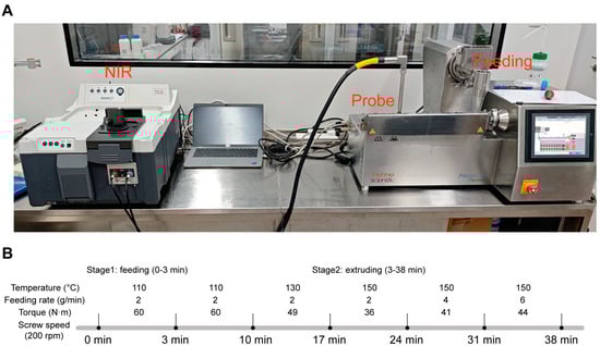 The system is composed of an extruder (left side) and a NIR spectrometer (right side). The extruder was equipped with an automatic feeder to ensure the addition of materials. Feeding rate, screw speed, and temperature were precisely controlled, and process conditions such as torque and real temperature were monitored as well. The process temperature was precisely adjusted through a cooling operation achieved by an external water-bath circulator.