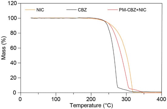 During thermal processing, ensuring the thermal stability of materials is vital to avoid potential thermal degradation. A thermogravimetric analysis of CBZ, NIC, and PM was carried out. The samples were heated to 400 °C at a rate of 20 °C/min. As presented in Figure 5, raw CBZ, NIC, and PM demonstrated one-step thermal degradation starting at temperatures above 240 °C. Furthermore, because the temperature used in this work was below 175 °C, the process temperature was safe for the raw materials.
