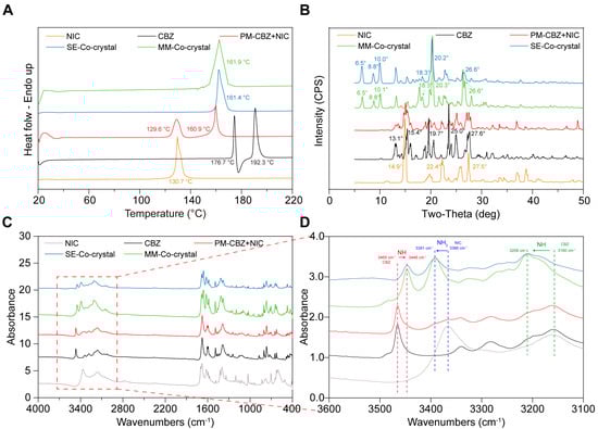 The characterization of CBZ, NIC, PM, and CC prepared by melting method (CC-MM) and solvent evaporation methods (CC-SE, prepared by ethanol). (A) DSC; (B) PXRD; (C,D) FTIR.