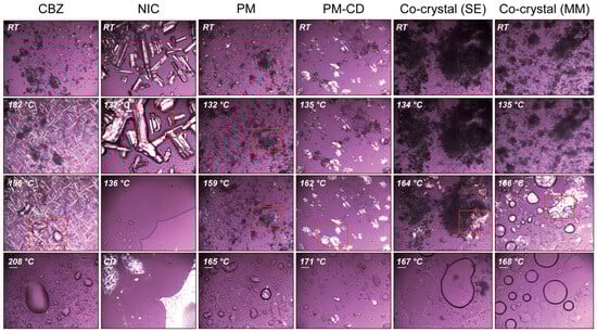 A CX40P polarized photomicroscope (Ningbo ShunYu Analytical Instrument Co., Ltd., Yuyao, China) integrated with a hot-stage (Linkam Scientific Instruments Ltd., Tadworth, Surrey, UK) was adopted to explore the melting behaviors of CBZ, NIC, PM, and CCs. The drug and the milled samples were uniformly distributed on a glass slide, and the extra powder was removed. The analysis was carried out at a ramp rate of 20 °C/min. Subsequently, a coverslip was placed on the sample slide, which was then positioned on the microscope stage for observation at 10-fold magnification. Images were taken by a dedicated digital camera (EP-SUF880, Quest Scientific Instruments Inc., North Vancouver, BC, Canada) under light and dark background conditions with the help of a 530-nm compensator (U-TP530, Olympus Corporation, Shinjuku City, Tokyo, Japan).