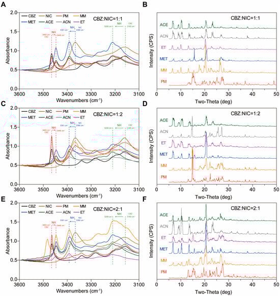 The FTIR and PXRD of CC with different molar ratios prepared by MM and solvent evaporation method in methanol (MET), ethanol (ET), acetonitrile (ACN), and acetone (ACE). The molar ratio of CBZ:NIC (A,B) was 1:1; (C,D) was 1:2; (E,F) was 2:1.
