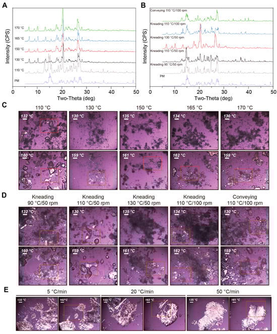 Additionally, the heating rate is another aspect worthy of investigation. The PM samples were heated to 170 °C at the rates of 5, 20, and 50 °C/min on hot-staged PLM, respectively. Subsequently, they were cooled to RT for PLM analysis. The initial heating ramp exhibited the same melting phenomenon, as depicted in Figure 7. As depicted in Figure 9E, all the samples melted at approximately 160 °C, suggesting that all CBZ and NIC formed CC, which means that the heating rate has no significant influence on the preparation of CC. These comprehensive thermal analyses establish processing temperature as the critical determinant for complete CBZ-NIC crystallization, while revealing heating rate independence within the experimental parameter space.