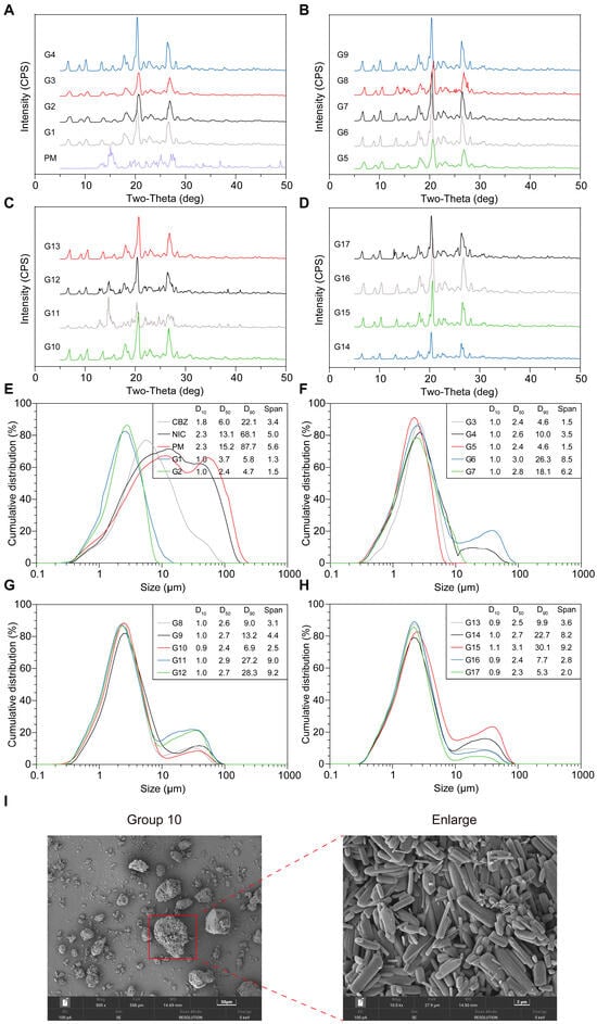 The PXRD results in Figure 6B show that the characteristic peaks of NIC are 14.9°, 22.4°, and 27.5°, and those of CBZ are 15.4°, 19.7°, and 25°, as reported [,]. The characteristic peaks of both ingredients were observed in the PM group. New characteristic peaks, such as 6.5°, 8.8°, 10.0°, and 20.3°, emerged in the products prepared using the MM and SE methods, which matched the reported CBZ-NIC CCs. Additionally, as the FTIR results shown in Figure 6C, after NIC and CBZ are successfully prepared into a CC, the -NH peaks of CBZ shift from 3160 cm−1 and 3465 cm−1 to 3208 cm−1 and 3446 cm−1, respectively, and the -NH2 peak of NIC shifts from 3366 cm−1 to 3391 cm−1, which can be observed in Figure 6C,D. The same results were obtained during the infrared characterization of the products prepared by MM and the solvent evaporation method, and the peaks corresponding to NIC and CBZ did not appear at their original positions. Notably, the absence of original NIC and CBZ characteristic peaks in both MM and SE products confirms complete CC formation. These complementary solid-state analyses conclusively demonstrate the successful generation of phase-pure CBZ-NIC CCs through both synthetic routes, with no residual precursors or physical mixture components detected.