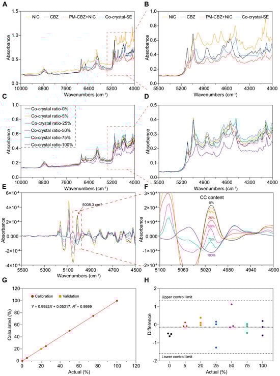 CC-SE was mixed with PM in the ratios of 0%, 5%, 25%, 50%, 75%, and 100% w/w. Subsequently, NIR was employed for detection purposes to determine the CC content of NIC and CBZ, and a linear regression equation was established. Detailed NIR experimental methods have been mentioned in Section 2.2.3.