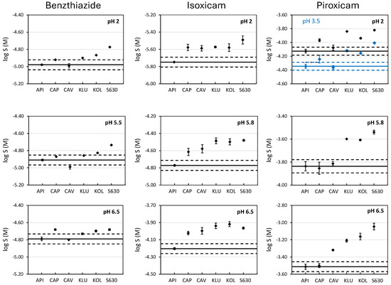 Solubility of benzthiazide, isoxicam, and piroxicam at pH 2, 5.8, and 6.5 without and with the presence of excipients. Black dots correspond to the experimental solubility at pH, 2, 5.8, and 6.5. For piroxicam, the blue dots correspond to the solubility at pH 3.5. The straight line represents the solubility of the compound without excipient (active pharmaceutical ingredient, API) and the dashed lines indicate the range log S0 ± 0.1. Excipients: Captisol (CAP), Cavasol (CAV), Klucel (KLU), Kollidon (KOL), and PVP S630 (S630).