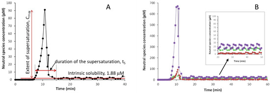 The CheqSol method not only provides the thermodynamic solubility of the neutral form (S0) of an ionizable compound but also the extent and time that a solution remains supersaturated before reaching S0. Both parameters are used to evaluate the supersaturation of a compound [10]. In this method, the experiment starts in conditions where the drug is completely ionized, and so, fully dissolved. Therefore, the concentration of the neutral species in solution is “zero”. The titration begins by titrating towards the pKa of the drug, to force precipitation as the neutral species starts to form. During this process, the concentration of the neutral species in solution increases to a maximum (Cmax) before the drug precipitates. When precipitation starts, it decreases dramatically to a much lower concentration to reach the intrinsic solubility. It must be noted that, before the drug precipitates, the solution is supersaturated. However, this supersaturated solution is thermodynamically unstable and has the tendency to quickly return to the equilibrium state by precipitation to the most stable form of the drug. The supersaturation parameters can be obtained from the plot that monitors the concentration of neutral species in solution against time. Figure 2A shows the plot obtained for isoxicam, which displays the concentration in solution of the neutral species of isoxicam collected during the CheqSol process. The extent of the supersaturation corresponds to the maximum concentration of the neutral species in solution (Cmax) before the drug precipitates, and the duration of the supersaturation (ts) is the amount of time that the drug stays supersaturated until it reaches equilibrium solubility. In addition, the supersaturation ratio (Rs) can be calculated by dividing Cmax by the intrinsic solubility (S0).