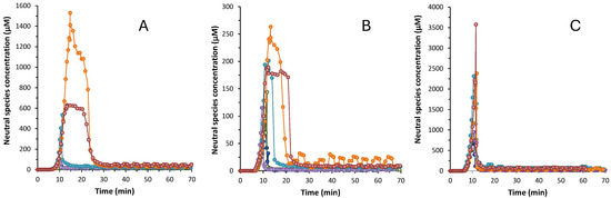 Concentration of the neutral species vs time plots for (A) benzthiazide; (B) isoxicam; (C) piroxicam. (●) Without excipient, (●) with captisol, (●) with cavasol, (●) with klucel, (●) with kollidon, and (●) with plasdone S630.