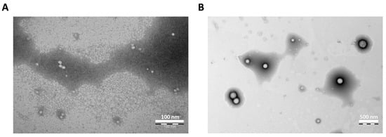 Photograph of (A) PTX NPs (scale bar 100 nm) and (B) CYP NPs (scale bar 500 nm) as determined by transmission electron microscopy.