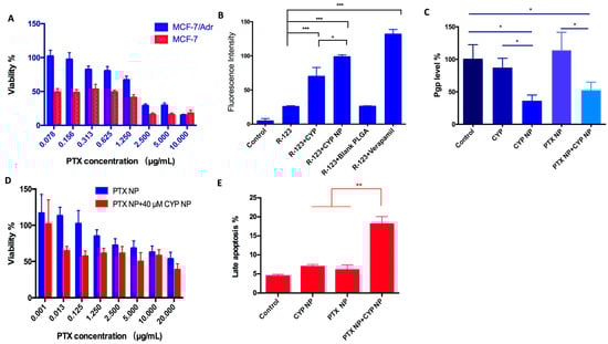(A) Survival rate of MCF-7 cells and MCF-7/Adr cells cultured with various concentrations of PTX solution for 48 h (n = 6). There were substantial differences (p < 0.01) between the two cell lines. (B) Internalization of R-123 by MCF-7/Adr cells after applying different CYP formulations (n = 3). (C) P-gp level of MCF-7/Adr cells after being treated with PBS (as control), CYP, CYP NPs, PTX NPs, and PTX NPs+CYP NPs. The final concentrations of CYP and PTX are 20 μM and 2.5 μg/mL, respectively (n = 3). (D) Survival rate of MCF-7/Adr cells after being cultured with different treatments for 48 h (n = 6). (E) Cell apoptosis evaluation of PBS (as control), CYP NPs, PTX NPs, and PTX NPs+CYP NPs against MCF-7/Adr cells for 24 h (n = 3). All the data are presented as the mean ± SD. * p < 0.05, ** p < 0.01, *** p < 0.001.