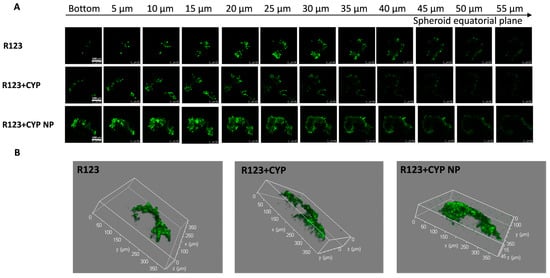 (A) Confocal Z-stack images of MCF-7/Adr tumor spheroids and (B) 3D integrated model after incubation with various R-123 solutions, R-123+CYP, R-123+CYP NPs for 24 h, respectively. Z-stack images were attained from the bottom towards the tumor spheroid equatorial plane at a 5 μm thickness. The scale bar represents 100 μm.