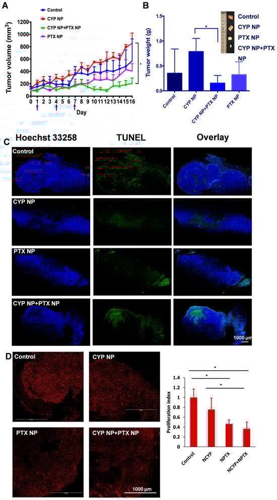 (A) Tumor volume–time curve of female MCF-7/Adr-bearing mice treated every three days for three i.v. injections of PTX NPs, peritumoral injections of CYP NPs, or saline control (n = 6 for control and CYP+PTX NP groups, n = 5 for CYP NP and PTX NP groups, arrows indicate the administration time). (B) Tumor tissues were separated and weighed on Day 16 after treatment with different formulations (n = 5 or 6). (C) Cell apoptosis by TUNEL staining and (D) proliferation by Ki-67 staining of the dissected tumor tissue after being treated with saline, CYP NPs, PTX NPs and PTX NPs+CYP NPs in vivo, respectively. Apoptotic cells were stained by TUNEL (green) and cell nuclei were stained with Hochest 33258 (blue). Ki-67-positive nuclei were red. The Ki-67-positive cell nuclei proportion relative to the total cell population defined the proliferation index. The results are presented as the mean ± SD. * p < 0.05.