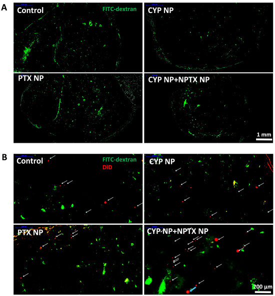 We next compared the biodistribution of nanoparticles and blood perfusion in different treatment groups. Mice from each group after treatment on Day 16 were intravenously injected with 100 μg/kg DiD-loaded PEG-PLA nanoparticles (representative small PTX NPs, 30 nm) and then intravenously injected with 10 mg/mouse FITC–dextran solution 5 h later. FITC–dextran (MW 500,000 Da) can adhere to the surface of the endothelial cells and then be absorbed into or retained in the vascular cavity as a perfusion indicator [60]. Therefore, the blood perfusion (Figure 5A) and distribution of PTX NPs in tumor tissue (Figure 5B) can be observed indirectly by laser scanning confocal microscopy. From the confocal images, compared with the control group, green fluorescence (FITC represents blood perfusion) and red fluorescence (DiD represents nanoparticles) in CYP NP-treated groups and the CYP NP+PTX NP group increased significantly. This highlights that small nanoparticles can reach the tumor site, and CYP NPs enhance blood perfusion, which contributes to reduced tumor angiogenesis and decreased matrix components [61].