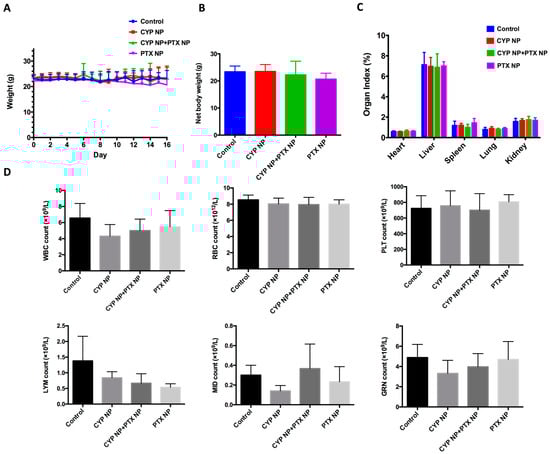 (A) Body weight, (B) net body weight and (C) organ index after treatment with different formulations in the tumor-bearing mice (n = 6 for control and CYP NP+PTX NP groups, n = 5 for CYP NP and PTX NP groups). (D) Hematological indicators including WBCs, RBCs, PLT, LYM and GRN on Day 16 (n = 4). The results are presented as the mean ± SD.