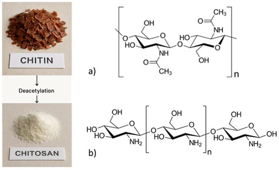 Chitin from crustacean shells (a) and chitosan (b) chemical structures.