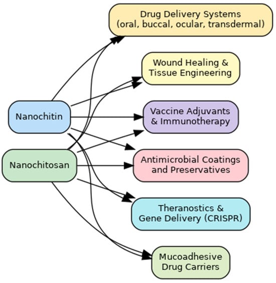 The properties of chitin and chitosan are markedly improved by nanosizing, which finds applications in nano-biomedicine, environmental science, and materials engineering. This surface-to-volume ratio enhances mechanical strength, colloidal stability, biocompatibility, and drug delivery efficiency. These modifications highlight nanochitin’s potential for advanced pharmaceutical formulations, including targeted delivery of pharmaceutical drugs and advanced wound dressing [,,].