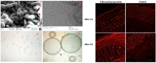 Scanning (A) and transmission electron (B) microscopic images at 100× (C) and 400× (D) magnification power of glimepiride optimized in ethosomal nano-vesicles (left); confocal laser microscope images for rat skin layers after application of fluorescence-labeled ethosomes films and rhodamine-loaded film at different time points (right). Reproduced with permission from reference [93]. Copyright 2016, Elsevier B.V.