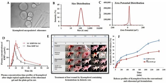 Hybrid lecithin–chitosan kaempferol ethosomes were prepared to treat diabetic foot ulcers. The surface morphology of the optimized ethosomes was captured with a transmission electron microscope (A) at magnifications of 10K×; the vesicular size of the nanoformulation was found to be 186.8 nm (B); the particle was recorded with a high zeta potential of 31.9 mV (C); the plasma concentration–time profile of ethosome formulation after a single topical application of the optimal LC-KMP-Eth gel (D) was recorded; significantly improved wound healing on a foot (E) was captured; and in vitro release profiling of the formulation (F) also were recorded. Images were taken with permission from the reference [94]. Copyright 2024, Elsevier B.V.