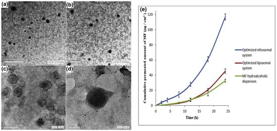 Mometasone furoate was formulated as an ethosome gel and evaluated for its anti-arthritic capacity in a rat model. The formulated vesicles were observed under transmission electron microscopy at different magnifications (a–d): (a) 25,000×, (b) 30,000×, (c) 40,000× and (d) 60,000×; (e) an ex vivo permeation profile of the formulation was observed at different mometasone-loaded ethosomes. Images were taken with permission from the reference [123]. Copyright 2020, Elsevier B.V.