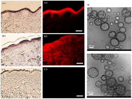 Fenretinide was formulated as an ethosome to act as a breast cancer chemopreventive treatment. The penetration and distribution of the fluorescent dye rhodamine B within skin tissue when incorporated into binary nanoformulations, as observed through various imaging techniques. Panels (A.1–C.1) present histological sections of skin visualized under halogen light, while panels (A.2–C.2) display fluorescence microscopy images (Bar = 100 µm) to assess dye distribution and autofluorescence. Panel (D) provides transmission electron microscopy images to characterize the morphology and size of the nanoformulations. The images were taken with permission from the reference [133]. Copyright 2021, Elsevier B.V.