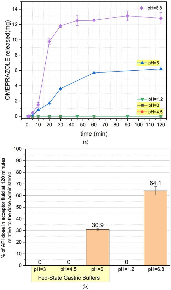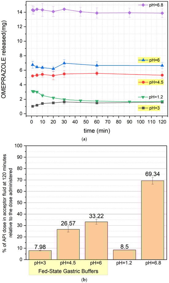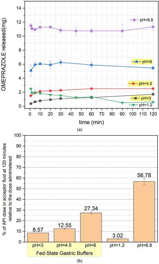 (a) OME release profile of formulation O3 (mean value ± SD from n = 3). (b) Percentage of OME left after 120 min of the test (mean value ± SD from n = 3) for formulation O3. The yellow background of the pH values indicates the results with fed-state buffers. % of API—% of omeprazole.