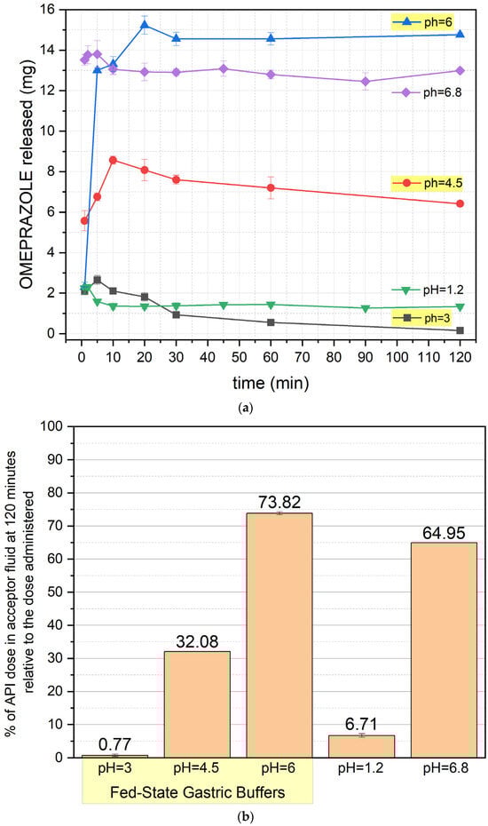 (a) OME release profile from a commercially available drug (mean value ± SD from n = 3). (b) Percentage of OME left after 120 min of the test (mean value ± SD from n = 3) for the commercially available drug. The yellow background of the pH values indicates the results with fed-state buffers. % of API (active pharmaceutical ingredient)—% of omeprazole.