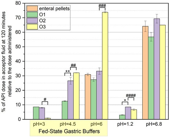 A statistically significant difference was also observed when comparing O3 and O2 at all pH values (except for the alkaline pH 6.8), where the O3 formulation achieved significantly higher drug concentrations in the dissolution medium. This suggests a potential role for the excipients used to achieve enteric coating in the commercial product from which the O2 formulation was prepared, as they appear to influence the extent of API degradation.