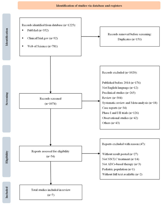 The PRISMA flowchart of the search strategy and study selection process is shown in Figure 1. The systematic search yielded 1225 records: 352 from PubMed, 781 from Web of Science, and 92 from ClinicalTrials.gov. After removing 151 duplicates, 1074 records were screened, and 1020 were excluded for various reasons: 176 were published before 2014; 265 were preclinical studies; 304 were reviews; 126 were phase I or I/II trials; 42 were observational studies; 34 were case reports; 18 were systematic reviews or meta-analyses; 12 were in non-English languages; and 43 were excluded for other reasons (e.g., cost-effectiveness analyses, letters, expert opinions, conference proceedings, or expanded-access programs). After full-text screening of 54 records for eligibility based on the PICOS criteria, 47 were excluded: 27 lacked results; 14 involved the wrong population (not NSCLC); 3 involved the wrong intervention (non-ADC therapies); 1 involved a pediatric population; and 2 were incomplete studies. Ultimately, seven clinical trials met the inclusion criteria and were included in review for further considerations.