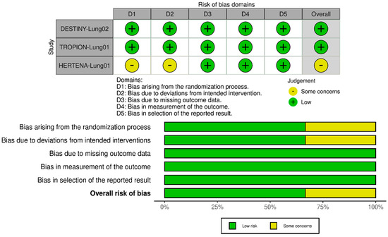 The visual representations of the risk of bias assessment for the RCTs included in the review are shown in Figure 2. The DESTINY-Lung02 [33] study demonstrates an overall low risk of bias across all domains, supported by robust randomization, effective blinding, objective outcome measurement criteria, and thorough data management, ensuring reliable results. The TROPION-Lung01 [34] study demonstrates a robust methodology with minimal risk of bias across all domains. Randomization was effectively implemented, and blinding of outcome assessment mitigated potential performance bias inherent in open-label designs. Furthermore, the trial adhered to its pre-registered protocol, ensuring transparency in outcome reporting. Overall, the study’s design and execution provide high confidence in the validity of its findings. In contrast, the HERTENA-Lung01 [35] study raises some concerns regarding bias in the randomization and intervention adherence domains, primarily due to its open-label design and limited details on the randomization process. However, the use of a blind independent central review (BICR) based on RECIST v1.1 for outcome assessment mitigates the potential impact of bias.