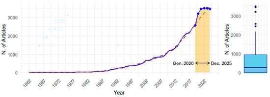- Identification of the Maximum Peak: The year with the highest deviation was extracted, marking the peak of the increase in scientific output.
