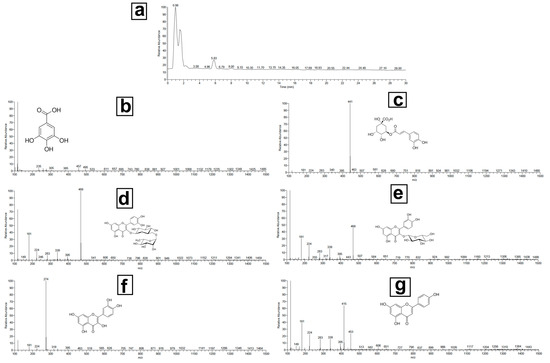 | 1 | 0.96 | Gallic acid | Phenolic acid | C7H6O5 | 169.01 | 125, 79 | [31] |