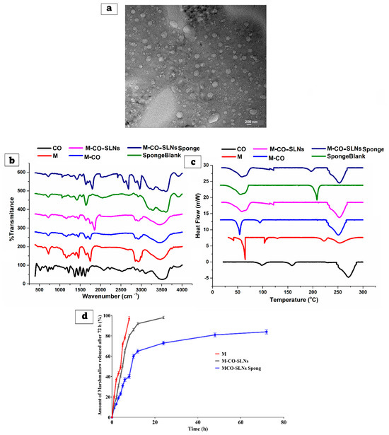 2.8.1. Characterization of M-CO-SLNs Sponges