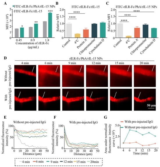 Extravasation of rILR-Fc/PhA/rIL-15 NPs across the tumor blood vessel. (A) Cellular uptake of the FITC-labeled rILR-Fc/rIL-15 or rILR-Fc/PhA/rIL-15 NPs by HUVECs after incubation for 1 h, as analyzed by flow cytometry. MFI, mean fluorescence intensity. Representative plots of flow cytometry are shown in Figure S7B. Data are means ± SD (n = 3). Statistical significance was calculated by two-way ANOVA with Holm–Sidak’s post hoc test. * p < 0.05, ** p < 0.01 and *** p < 0.001 compared with the FITC-rILR-Fc/rIL-15 group. (B,C) The uptake of rILR-Fc/rIL-15 (B) or rILR-Fc/PhA/rIL-15 NPs (C) by HUVECs, as analyzed by flow cytometry in the presence of various endocytosis inhibitors. The MFI of each group was normalized to that of the control group. Representative plots of flow cytometry are shown in Figure S7D. Data are means ± SD (n = 3). Statistical significance was calculated by one-way ANOVA with Tukey’s post hoc test. **** p < 0.0001. (D) Intravital fluorescence imaging of the extravasation of rILR-Fc/PhA/rIL-15 NPs at different times, with or without the pre-injection of an excessive amount of IgG in orthotopic CT26-Luc tumors. Red denotes the fluorescence signal of ICG-rILR-Fc. Bars, 50 μm. (E,F) Plots of the fluorescence intensity of ICG-rILR-Fc/PhA/rIL-15 NPs without (E) or with (F) blockade by IgG at various time points, as a function of the distance from the blood vessel, in a representative region marked by the white line in (D). (G) The AUNFICs of rILR-Fc/PhA/rIL-15 NPs at different times, with (E) or without (F) pre-injection with IgG.