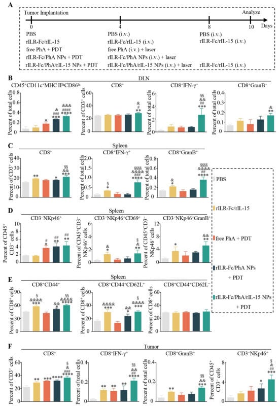 rILR-Fc/PhA/rIL-15 NPs elicited systemic anticancer immunity. (A) Scheme of therapeutic regimen for flow cytometry analysis of various immune cells. PBS group, mice treated with PBS. rILR-Fc/rIL-15 group, mice injected with rILR-Fc/rIL-15 (0.3 mg/kg of rIL-15). Free PhA + PDT group, mice injected with free PhA (2.5mg/kg) followed by laser treatment. rILR-Fc/PhA NPs + PDT group, mice injected with rILR-Fc/PhA NPs (2.5 mg/kg of PhA) followed by laser treatment. rILR-Fc/PhA/rIL-15 NPs + PDT group, mice injected with rILR-Fc/PhA NPs (2.5 mg/kg of PhA + 0.3 mg/kg of rIL-15) followed by laser treatment. For the laser treatment, the mice were irradiated with a 660 nm laser (80 W/cm2) for 10 min at 35 min post-injection. (B) Quantitative analysis of CD45+CD11c+MHCIIhiCD86hi cells, CD8+ T cells, CD8+IFN-γ+ T cells, and CD8+GranB+ T cells in DLN. Representative plots of flow cytometry are shown in Figure S10. (C–E) Quantitative analysis of CD8+ T cells, CD8+IFN-γ+ T cells, CD8+GranB+ T cells, CD45+CD3−NKp46+ cells, CD45+CD3−-NKp46+CD69+ cells, CD45+CD3−NKp46+GranB+ cells, CD8+CD44+ T cells (memory), CD8+CD44+CD62L− T cells (effector memory), and CD8+CD44+CD62L+ T cells (central memory) in the spleen. Representative plots of flow cytometry are shown in Figure S11. (F) Quantitative analysis of CD8+ T cells, CD8+IFN-γ+ T cells, CD8+GranB+ T cells, and CD45+CD3−NKp46+ cells in tumors. Representative plots of flow cytometry are shown in Figure S12B. Data are means ± SD (n = 3). Statistical significance was calculated by one-way ANOVA with Dunnett’s post hoc test. * p < 0.05, ** p < 0.01, *** p < 0.001, and **** p < 0.0001 compared with the PBS group. # p < 0.05, ## p < 0.01, ### p < 0.001, and #### p < 0.0001 compared with the rILR-Fc/rIL-15 group. & p < 0.05, && p < 0.01, &&& p < 0.001, and &&&& p < 0.0001 compared with the free PhA + PDT group. § p < 0.05, §§ p < 0.01, and §§§§ p < 0.0001 compared with the rILR-Fc/PhA NPs + PDT group.