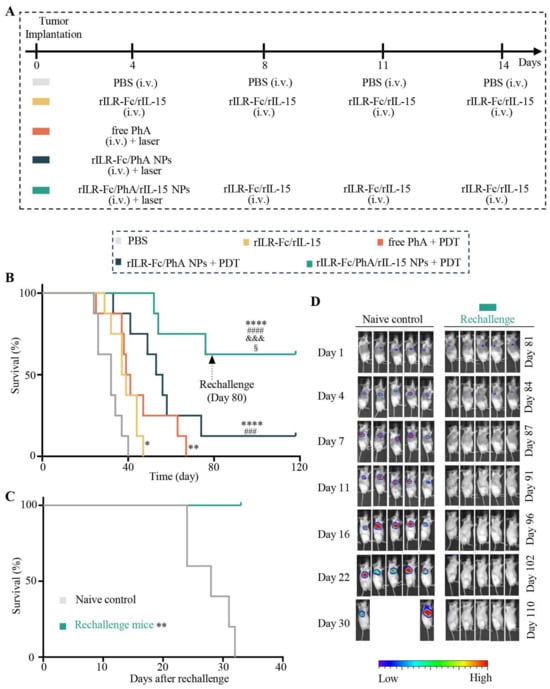 The therapeutic effect of rILR-Fc/PhA/rIL-15 NPs on mice bearing orthotopic CT26-Luc tumors. (A) Scheme of therapeutic regimen. PBS group, mice treated with PBS. rILR-Fc/rIL-15 group, mice injected with rILR-Fc/rIL-15 (0.3 mg/kg of rIL-15). Free PhA + PDT group, mice injected with free PhA (2.5 mg/kg) followed by laser treatment. rILR-Fc/PhA NPs + PDT group, mice injected with rILR-Fc/PhA NPs (2.5 mg/kg of PhA) followed by laser treatment. rILR-Fc/PhA/rIL-15 NPs + PDT group, mice injected with rILR-Fc/PhA NPs (2.5 mg/kg of PhA + 0.3 mg/kg of rIL-15) followed by laser treatment. For the laser treatment, the mice were irradiated with a 660 nm laser (80 W/cm2) for 10 min at 35 min post-injection. (B) Kaplan–Meier survival plots of the CT26-Luc-bearing mice after different treatments, as illustrated in (A). Significance was determined by log-rank analysis (n = 8). * p < 0.05, ** p < 0.01, and **** p < 0.001 compared with the PBS group. ### p < 0.01, #### p < 0.001 compared with the rILR-Fc/rIL-15 group. &&& p < 0.001 compared with the free PhA + PDT group. § p < 0.05 compared with the rILR-Fc/PhA NPs + PDT group. (C,D) Kaplan–Meier survival curve (C) and bioluminescence imaging (D) of rechallenged long-term survivors from (B) rILR-Fc/PhA/rIL-15 NPs + PDT group (n = 5). The tumor-free mice were inoculated with CT26-Luc cells (5 × 105) subcutaneously at day 80. Naive control and naive BALB/c mice were inoculated with an equivalent quantity of CT26-Luc cells on the same day (n = 5). The tumor growth curves of these mice are shown in Figure S14. Significance was determined by log-rank analysis; ** p < 0.01 compared with the naive control group.