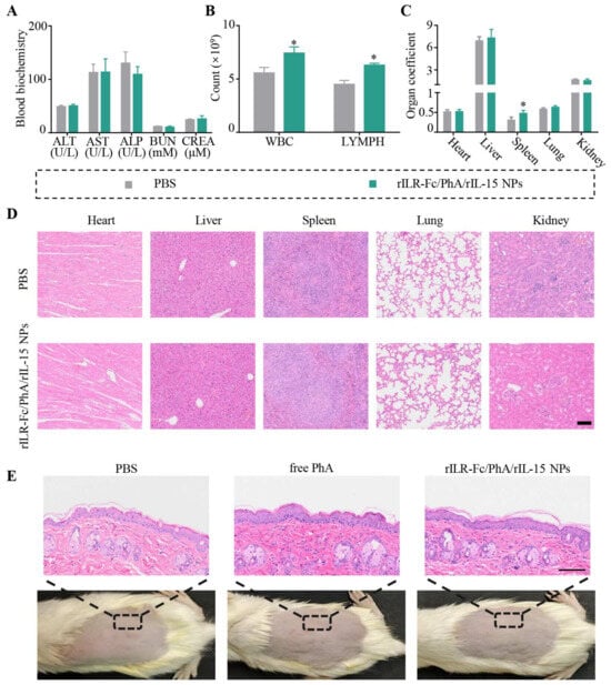 To investigate the biosafety of the rILR-Fc/PhA/rIL-15 NPs in vivo, the liver and renal function was assessed through blood biochemistry tests. No significant changes in alanine transaminase (ALT), aspartate transaminase (AST), blood urea nitrogen (BUN), and creatinine (CREA) were observed in the rILR-Fc/PhA/rIL-15 NPs group compared with the PBS control (Figure 7A and Table S3). Most hematologic parameters did not show significantly changes, apart from the counts of white blood cells (WBC) and lymphocytes (LYMPH) (Figure 7B and Table S3). Additionally, the rILR-Fc/PhA/rIL-15 NPs did not cause significant changes in body weight (Figure S15A) compared with the PBS control. Except for the spleen, all investigated organs’ coefficients were not changed (Figure 7C and Figure S15B). The increase in the organ coefficient of the spleen could be attributed to the promotion of T cell proliferation in the spleen by the rILR-Fc/PhA/rIL-15 NPs. This was in line with a previous report that an IL-15 fusion protein led to lymphocytosis in the blood and splenomegaly [,]. Additionally, the rILR-Fc/PhA/rIL-15 NPs did not cause noticeable tissue damage in the major organs analyzed by H&E staining (Figure 7D).