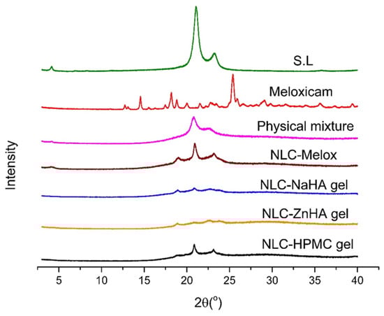 The drug’s transition from a crystalline to an amorphous or dissolved state within the formulation was evaluated with X-ray Diffraction (XRD). Analysis was performed on each sample (pure Melox, S.L, physical mixture melt, NLC–Melox, and NLC-loaded gels).