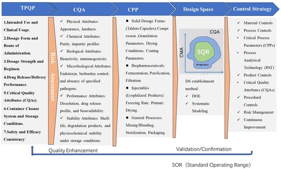 - Pazhayattil, A.B.; Sharma, S.; Philip, J.P.; Gischewski-Silva, M.; Ingram, M. Quality by Design (QbD) Process Design. In Technology Transfer: Drug Product Manufacturing Process; Springer International Publishing: Berlin/Heidelberg, Germany, 2023; pp. 11–28. [Google Scholar] [CrossRef]