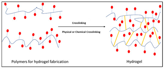 Hydrogels are three-dimensional polymeric networks capable of absorbing significant quantities of aqueous solutions, including water and physiological fluids, while retaining their structural stability and insoluble nature [80,81,82]. In recent times, hydrogels have emerged as a pivotal entity in the realm of drug delivery, assuming a profound role as drug carriers and exhibiting potential as a platform for accomplishing sustained and prolonged drug release [83]. In addition to the fact that hydrogels possess the ability to mimic the extracellular matrix (ECM), they create an optimal milieu for cellular proliferation and tissue regeneration, which has resulted in considerable interest in their use in regenerative medicine [84,85]. With their exceptional ability to swell, their high permeability, and their biodegradability, they are extensively suitable as vehicles for drug delivery [86,87]. Depending on the fabrication method, they are classified into physically crosslinked and chemically crosslinked hydrogels as shown in Figure 1 [88].