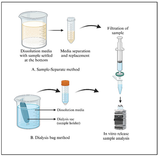 The most widely used technique for assessing the release profile of long-acting formulations is the sample-and-separate method, owing to its ease of use and practicality. This approach involves suspending micro- or nanoparticles in a specific volume of release media and agitating the system. Samples are taken at different intervals, filtered, or centrifuged to separate the particles from the media, and the media is replaced in the dissolution vessel (Figure 3). In vitro release studies involve adjusting several parameters for effective sample analysis, and one such crucial parameter is agitation. To simulate the physiological flow rates, agitation speeds are typically achieved at a speed of 100 rpm. Various methods, such as magnetic stirrers, shaking water baths, and rotating bottles, can be used for agitation [254,255,256].