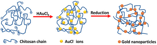 Schematic representation for the formation of gold nanoparticles in the cross-linked chitosan hydrogel.