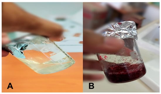 Images of the formulated (A) CS and (B) CS-Au hydrogels showing the viscosity and color change.