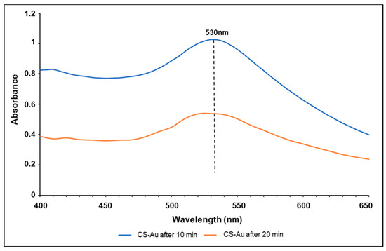 The UV-vis spectra for the CS-Au hydrogels after heating for 10 and 20 min are shown in Figure 3. The SPR of the AuNPs showed a singular narrow peak at 530 nm, aligning with the predicted λmax of AuNPs, presenting tangible confirmation of the successful synthesis of the AuNPs [13]. The peak singularity indicates negligible by-product formation. A significant reduction in absorbance intensity was apparent after 10 min of heating.
